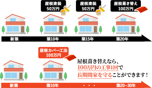また「葺き替えは高い」と思われがちですが、実は、塗装工事は10〜15年毎に塗り替える必要があり、長期的にはリフォーム費用が高額になります。長く住まわれる場合は葺き替えがおすすめです。