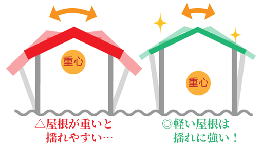 地震時の家屋の揺れはその重心位置に大きく左右されます。屋根が軽いほど重心の位置も下がり、地震に強い家になります。屋根葺き替えで軽い屋根材に変えると、耐震性を高めることができます。