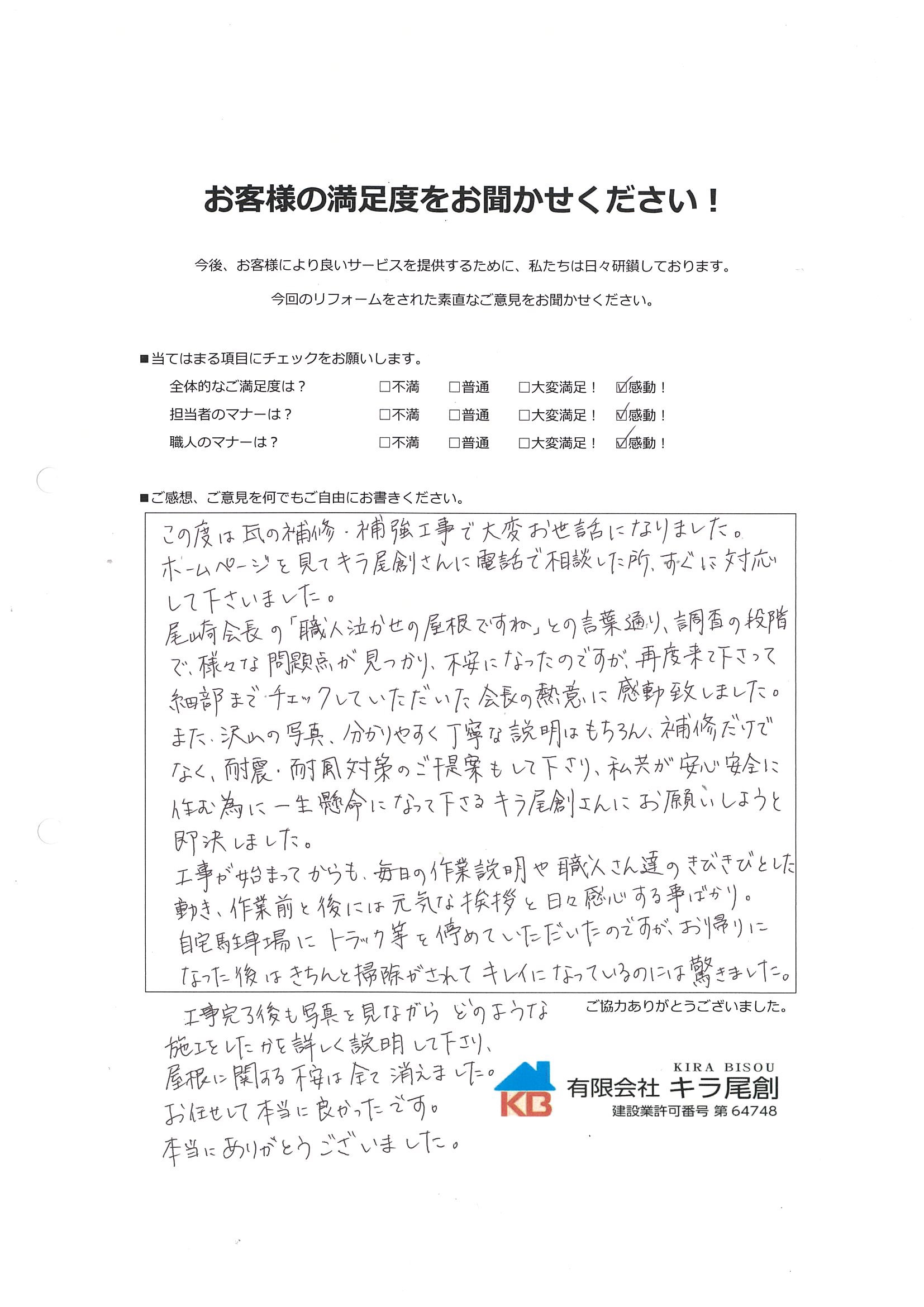 また、沢山の写真、分かりやすく丁寧な説明はもちろん、補修だけでなく、耐震・耐風う対策のご提案もして下さり、私共が安心安全に住む為に一生懸命になって下さるキラ尾創さんにお願いしようと即決しました。