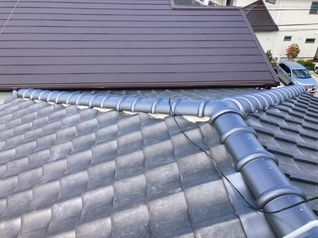 棟瓦のズレなどの不具合を解決すべき、今回は棟の高さを低くして耐震棟工事をご提案させて頂き、下屋根の棟は漆喰の塗り替えをご提案させて頂きました。